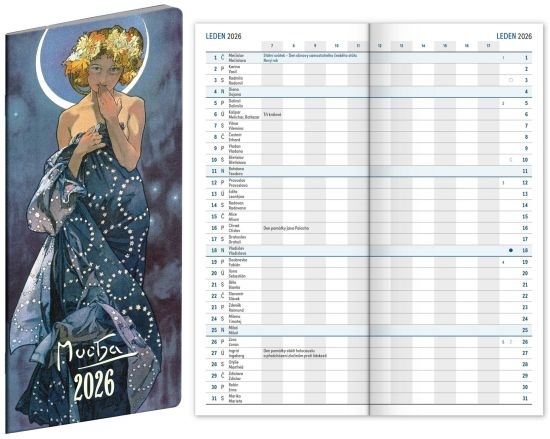 Diář měsíční, kapesní, 8x18 cm, Alfons Mucha 2026