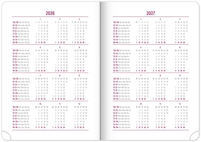 - kalendárium: šestijazyčné (CZ, SK, EN, DE, HU, RU) týdenní jmenné