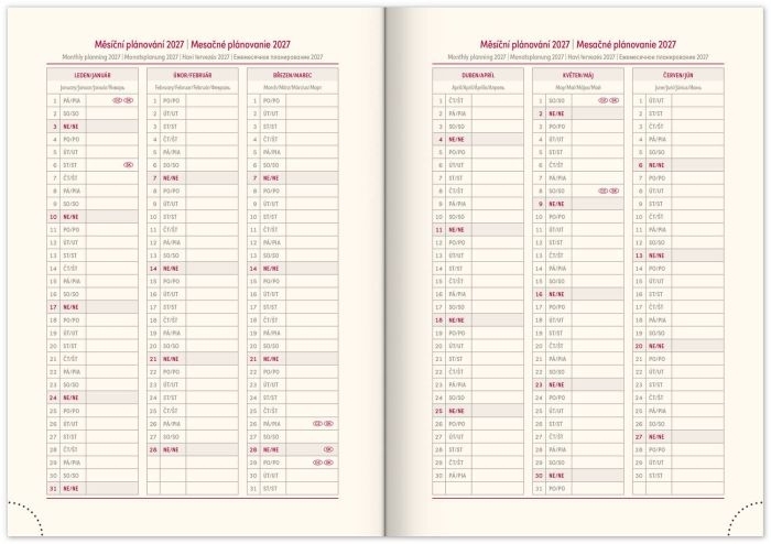 - kalendárium: šestijazyčné (CZ, SK, EN, DE, HU, RU) denní jmenné