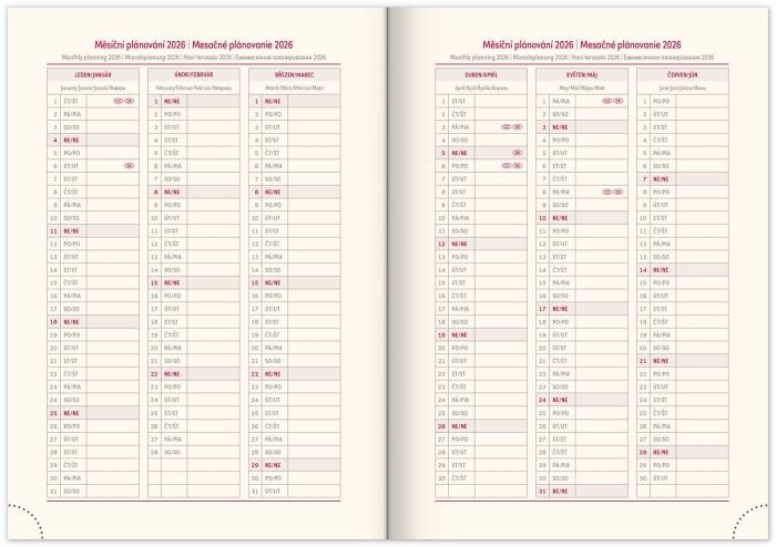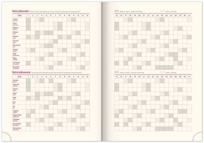 - kalendárium: šestijazyčné (CZ, SK, EN, DE, HU, RU) týdenní jmenné