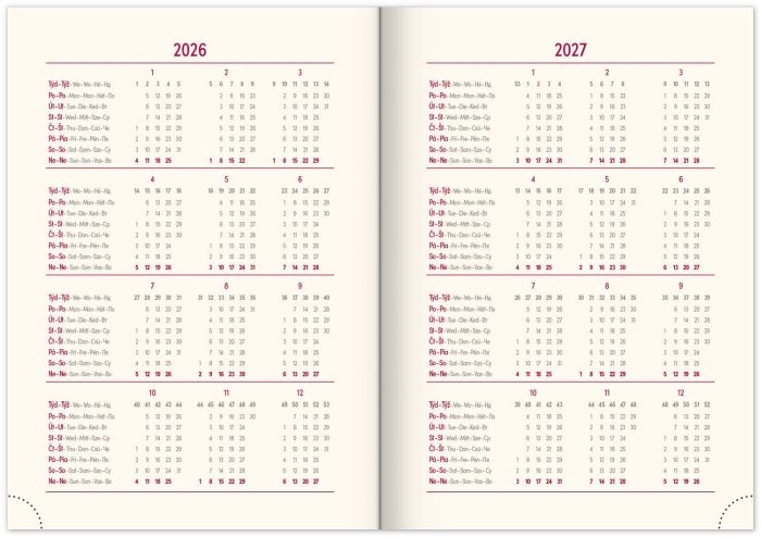 - kalendárium: šestijazyčné (CZ, SK, EN, DE, HU, RU) týdenní jmenné
