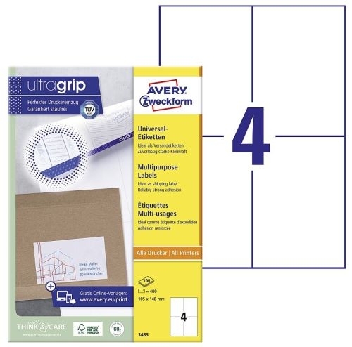 Etikety univerzální Avery 3483, 105x148 mm, bílé, 100 listů