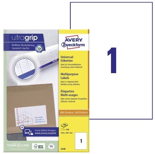 Etikety univerzální Avery 3478, 210x297 mm, bílé, 100 listů